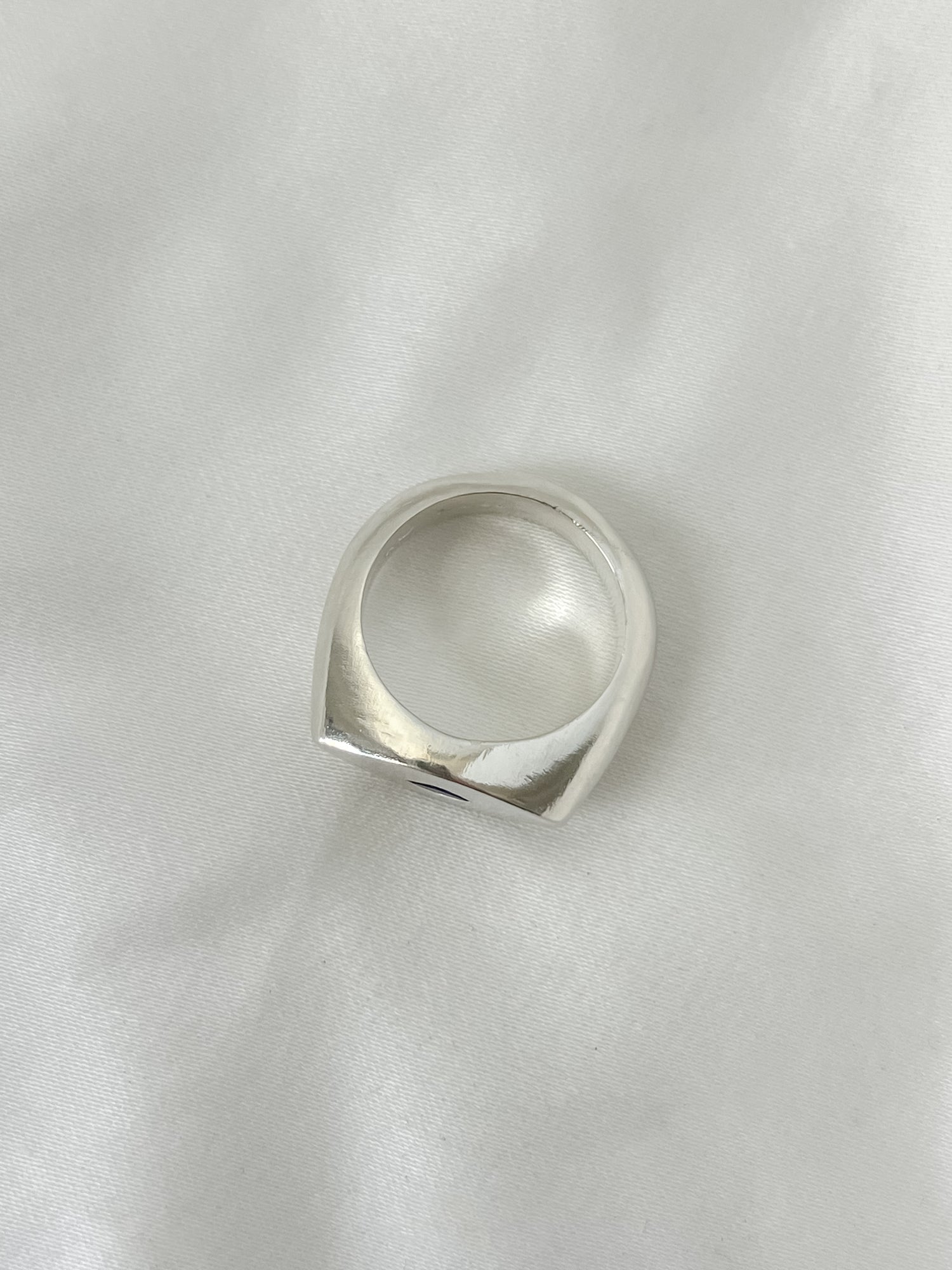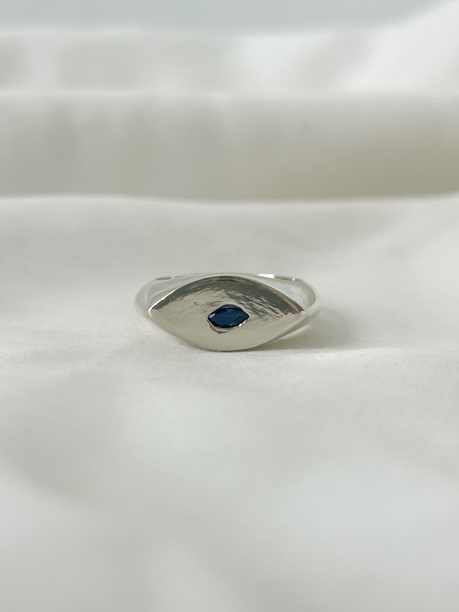 A .925 sterling silver sand cast ring with an easy, organic shape that feels smooth and substantial. Featuring a 3x6mm, deep blue, AAA grade Sapphire flush-set into the surface, adding just the right pop of color while keeping the look clean and minimal.