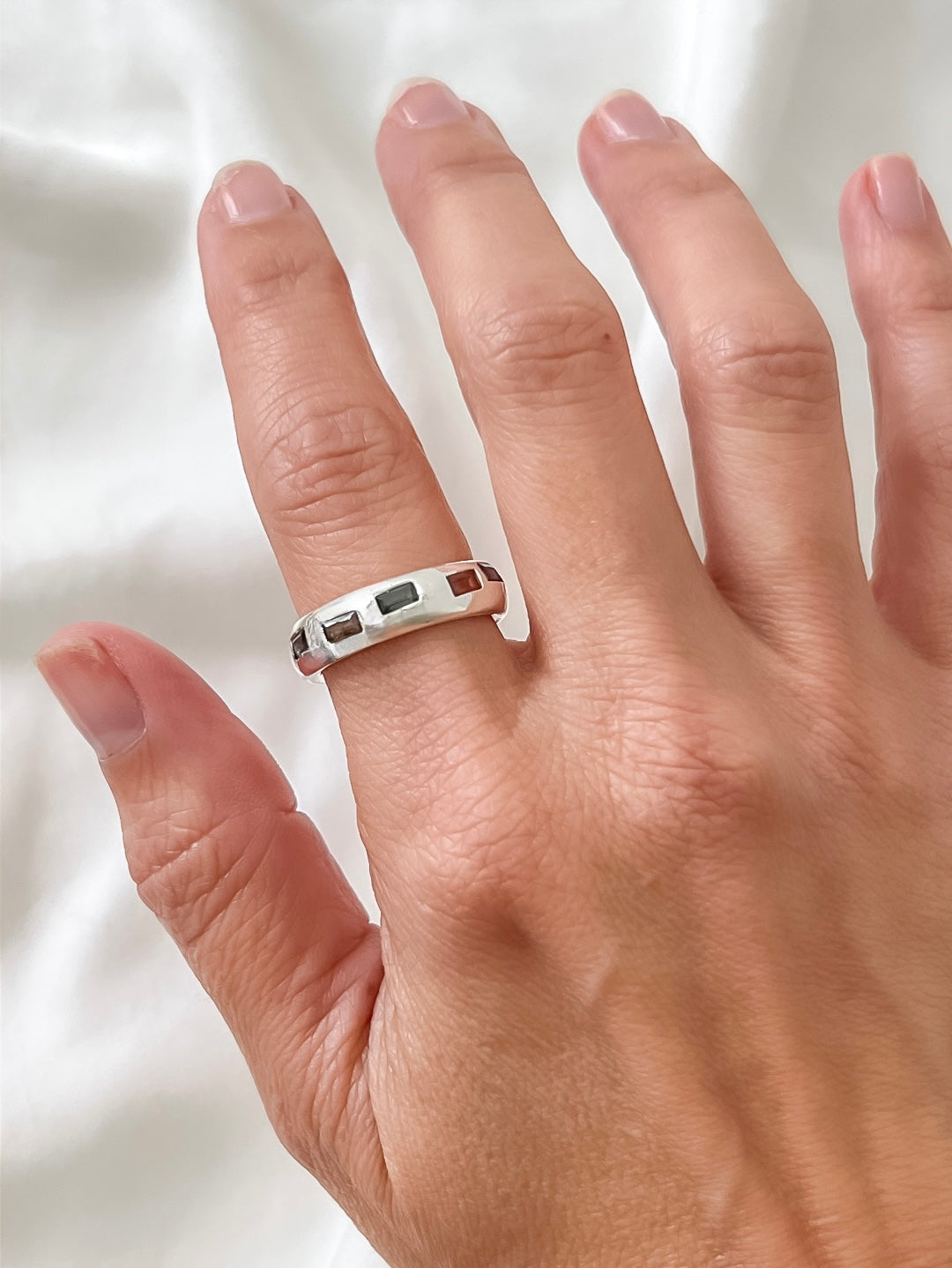 This ring also features raw inclusions such as indentations made from the clay and has a more organic shape- meaning it is not perfectly round. These are completely normal things that happen during the sand casting process and makes each and every ring even more unique!