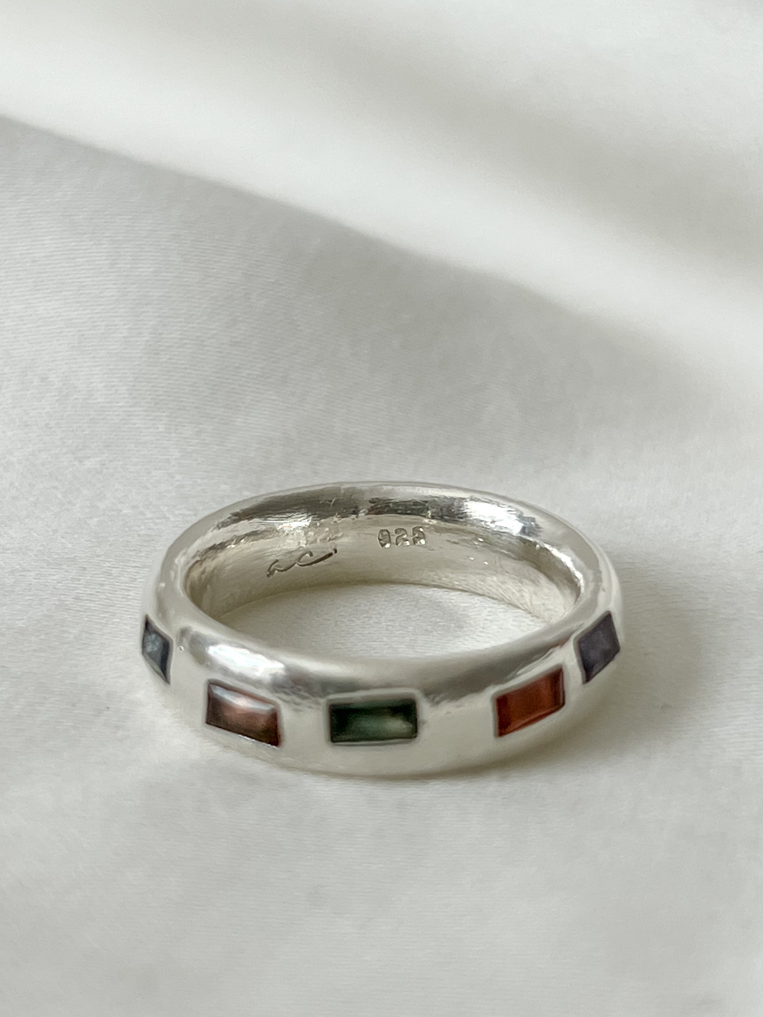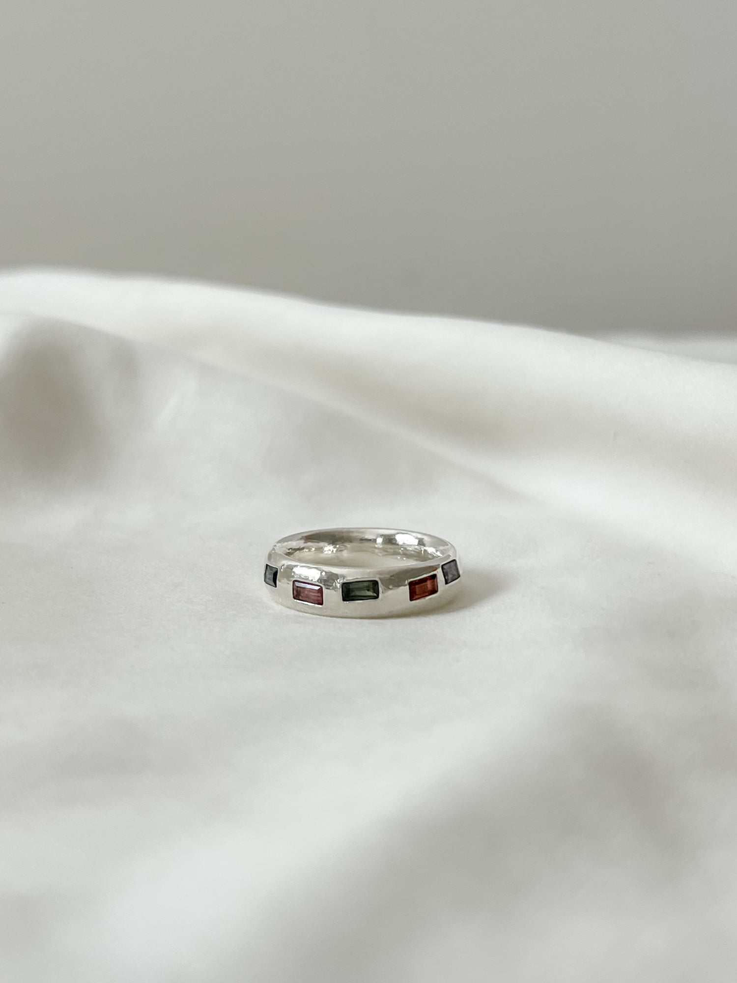 This ring features 5- AAA grade baguette Sapphires in jewel tone colors