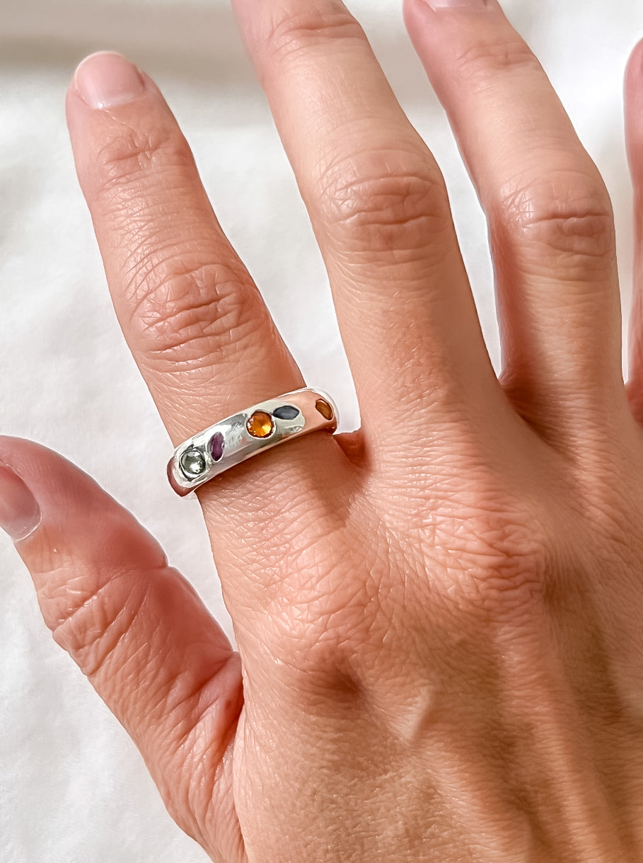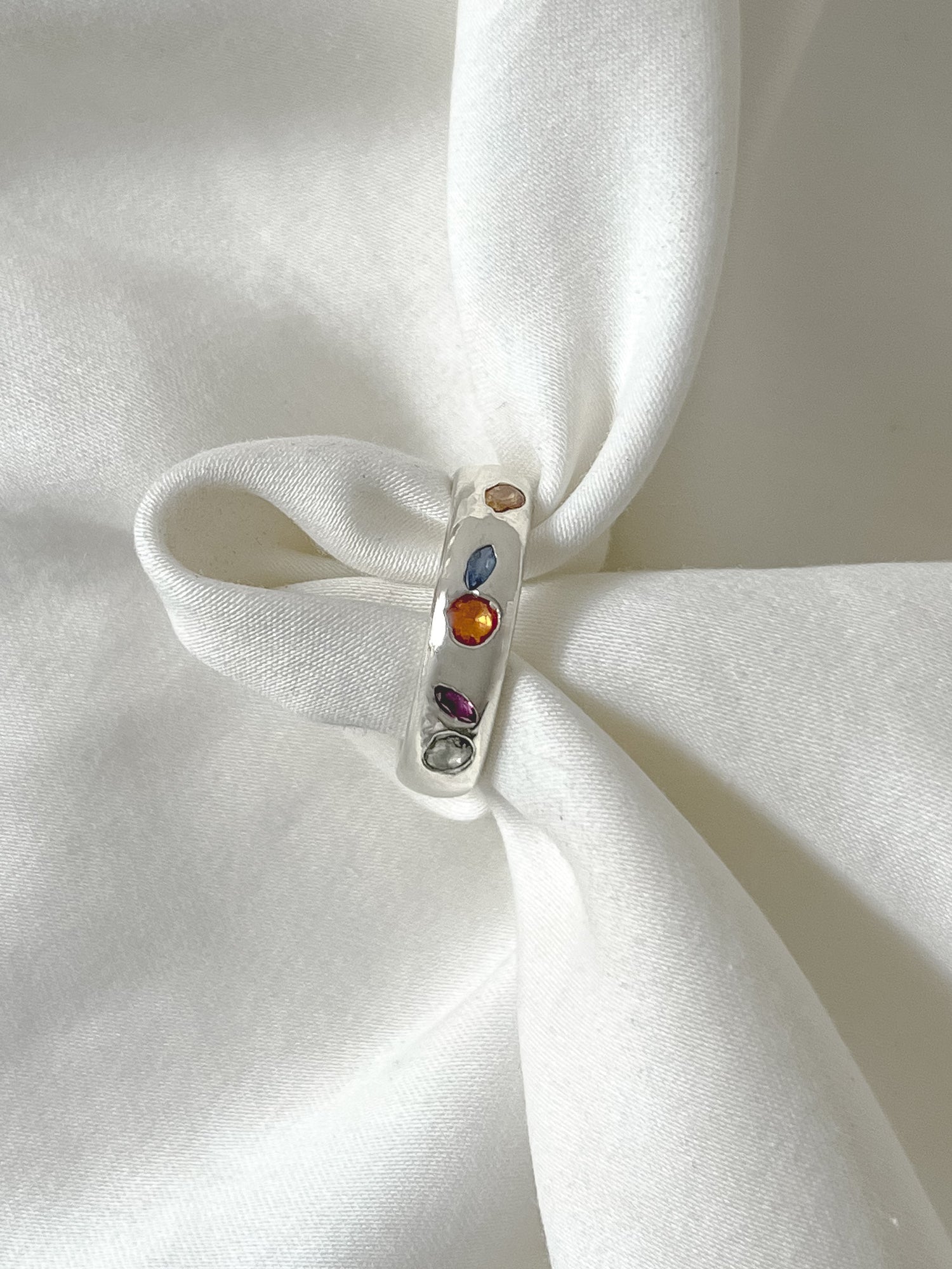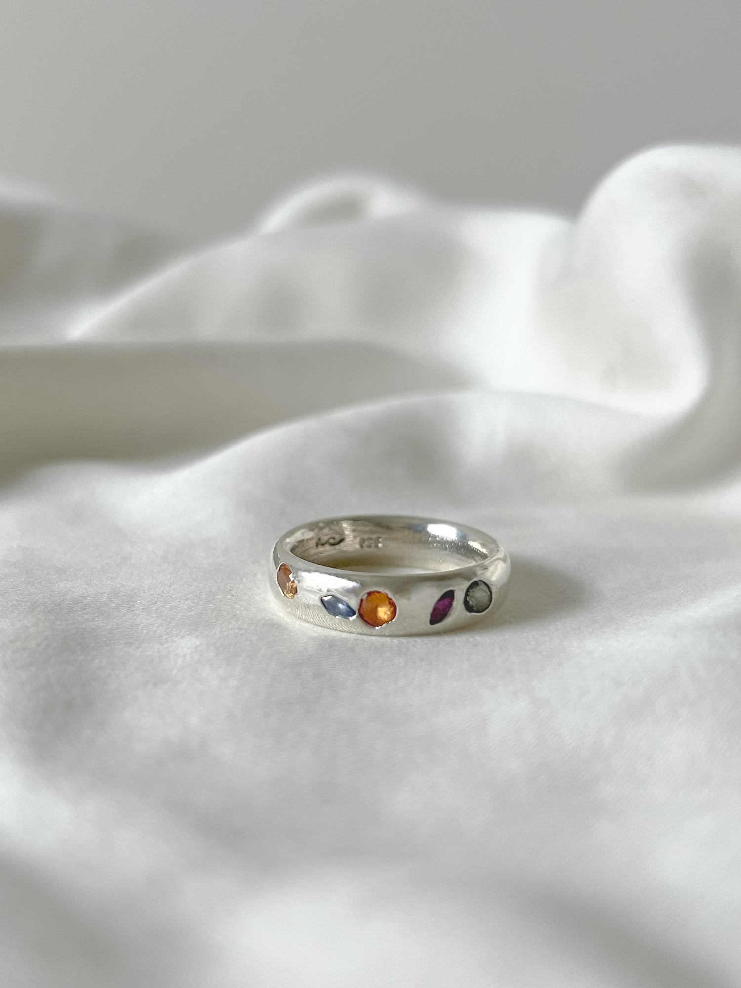 This .925 Sterling Silver ring features 5- AA grade Sapphires in various shapes and colors