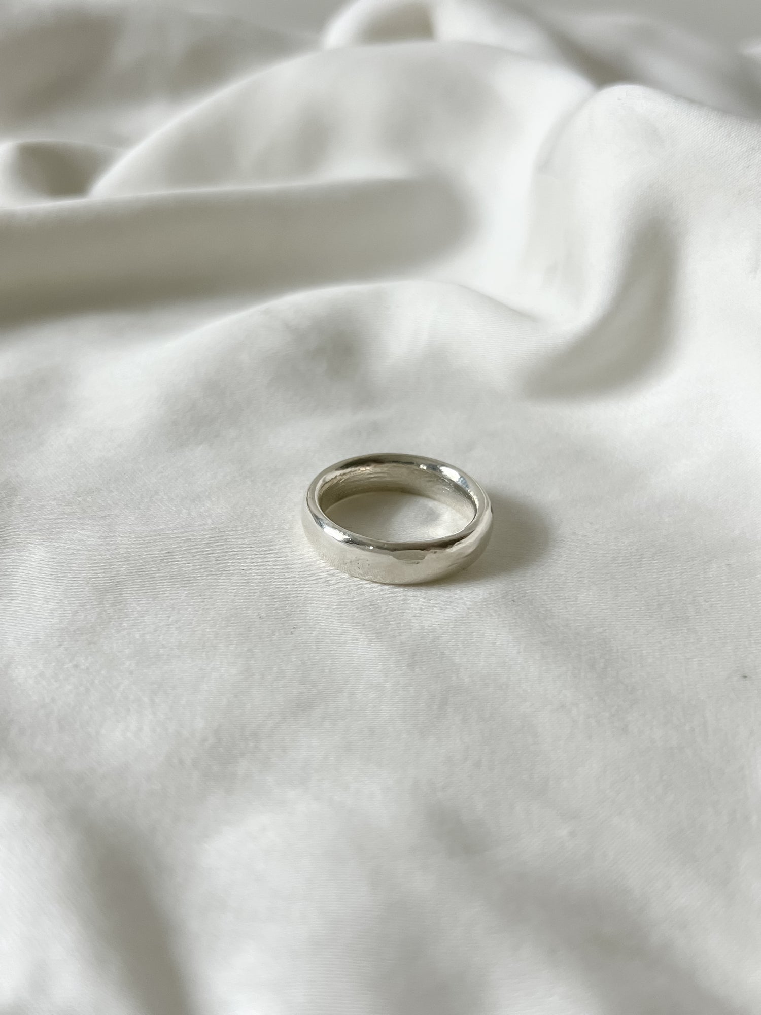 This ring also features raw inclusions such as indentations made from the clay and has a more organic shape- meaning it is not perfectly round. These are completely normal things that happen during the sand casting process and makes each and every ring even more unique!
