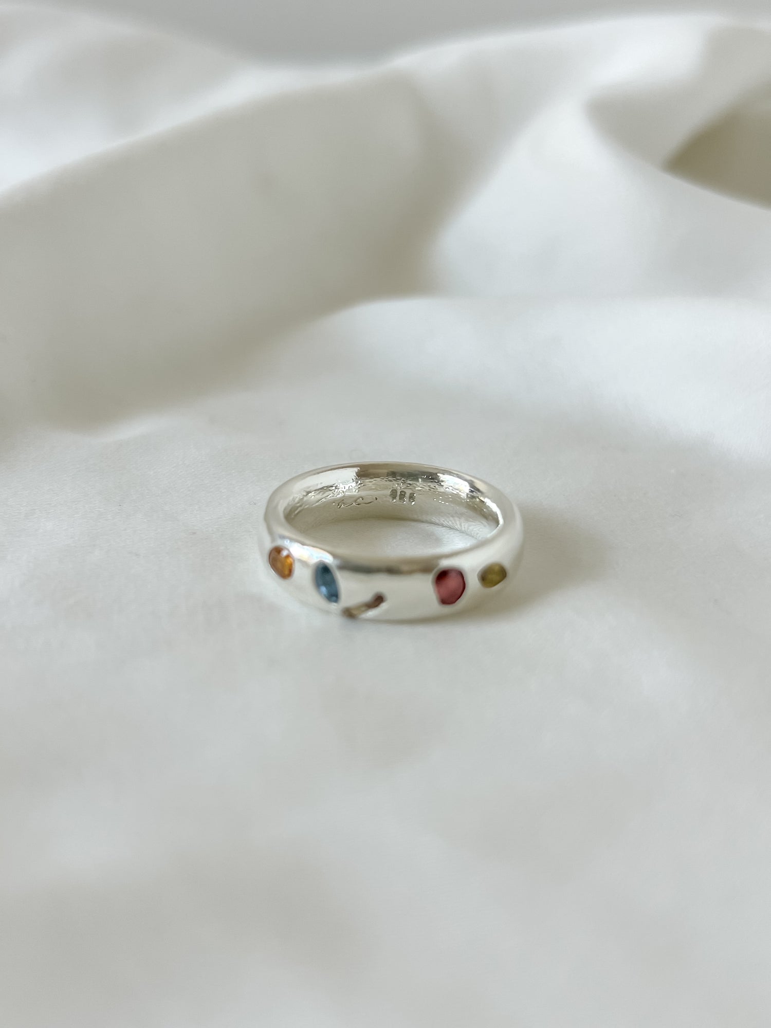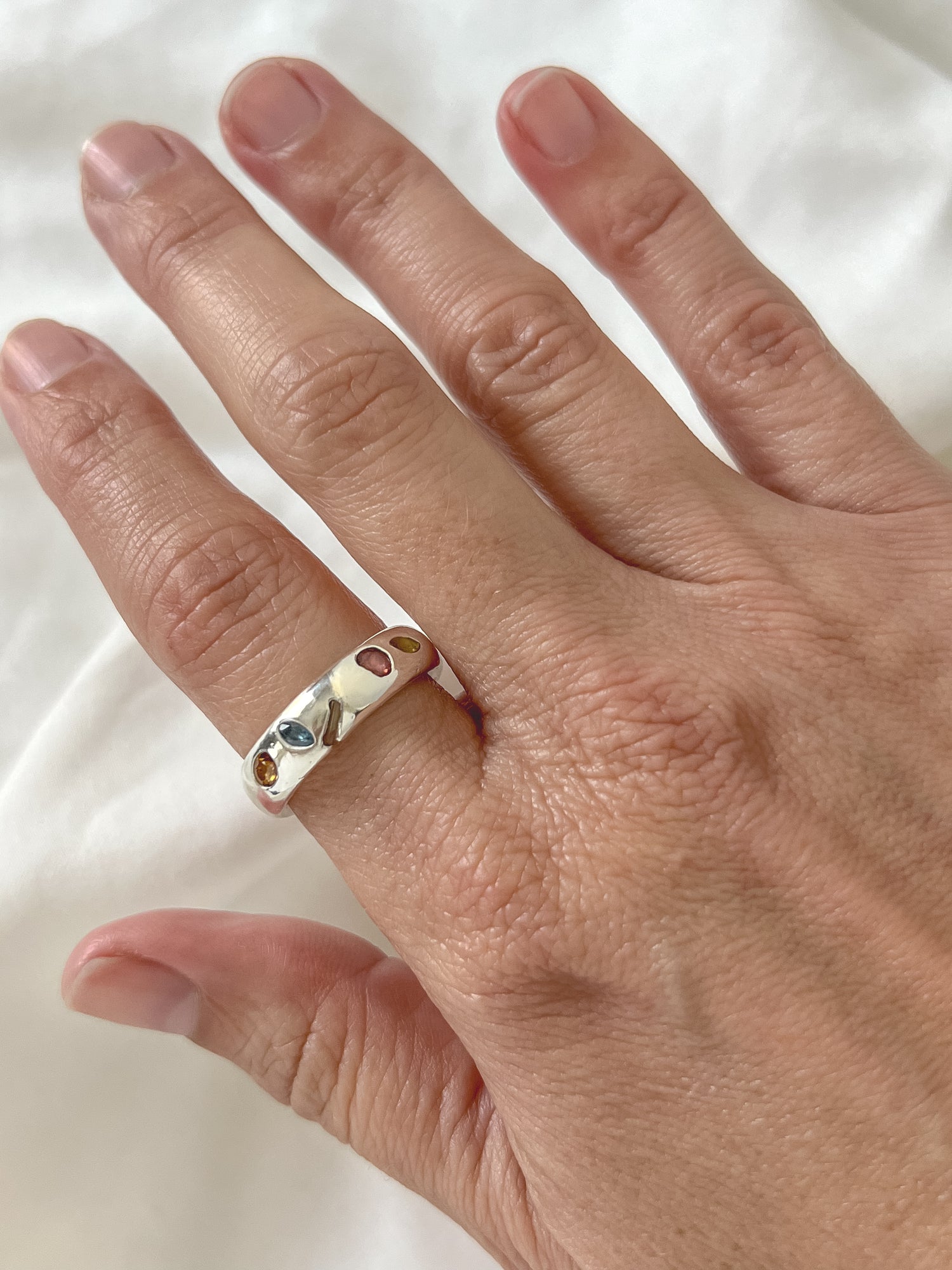 This .925 Sterling Silver ring features 5- AA grade Sapphires in various shapes and colors