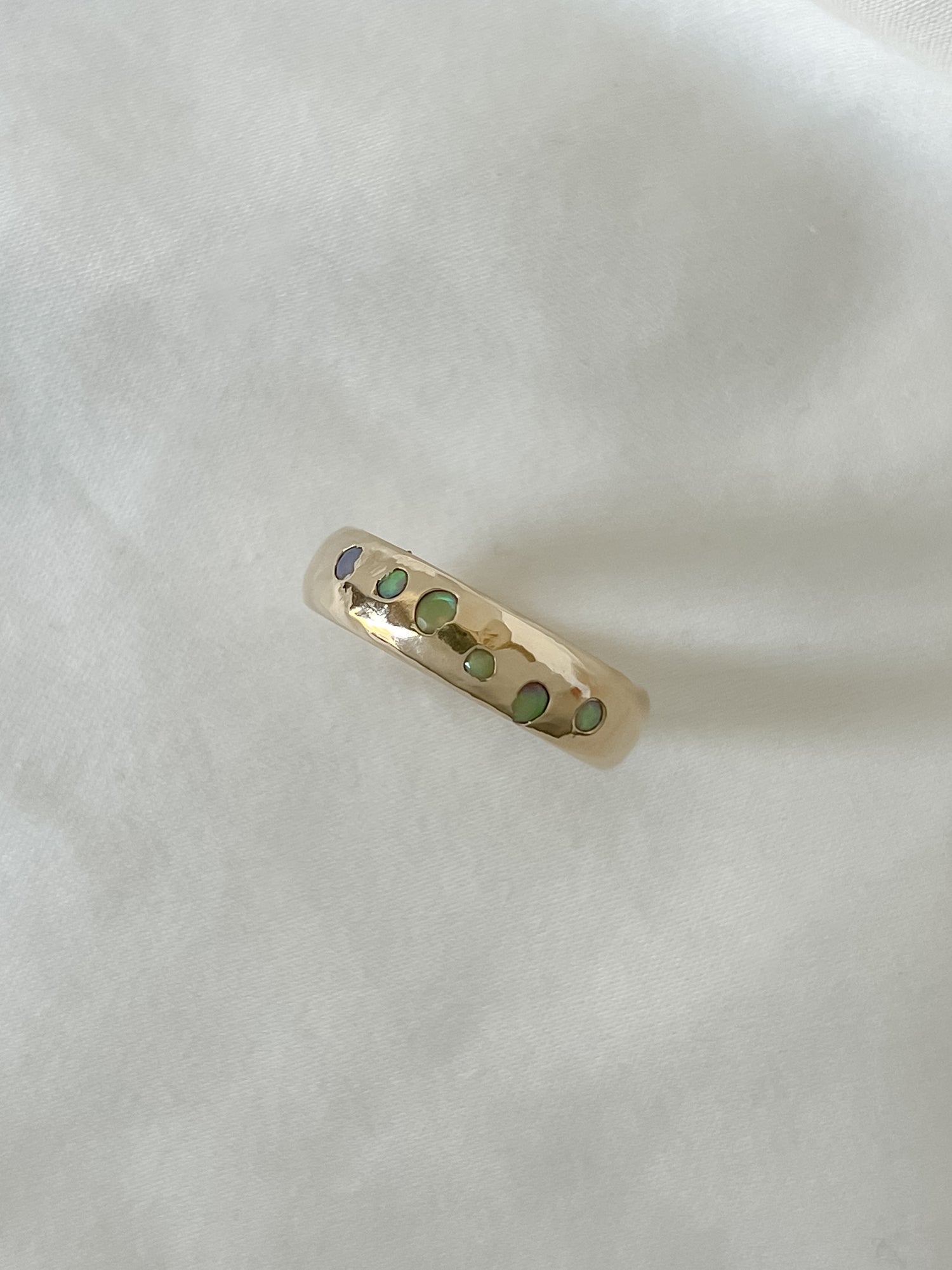 This 10k solid gold ring features 3- 3mm and 3- 2mm cultured Opals that flash in different shades depending on how the light hits it.