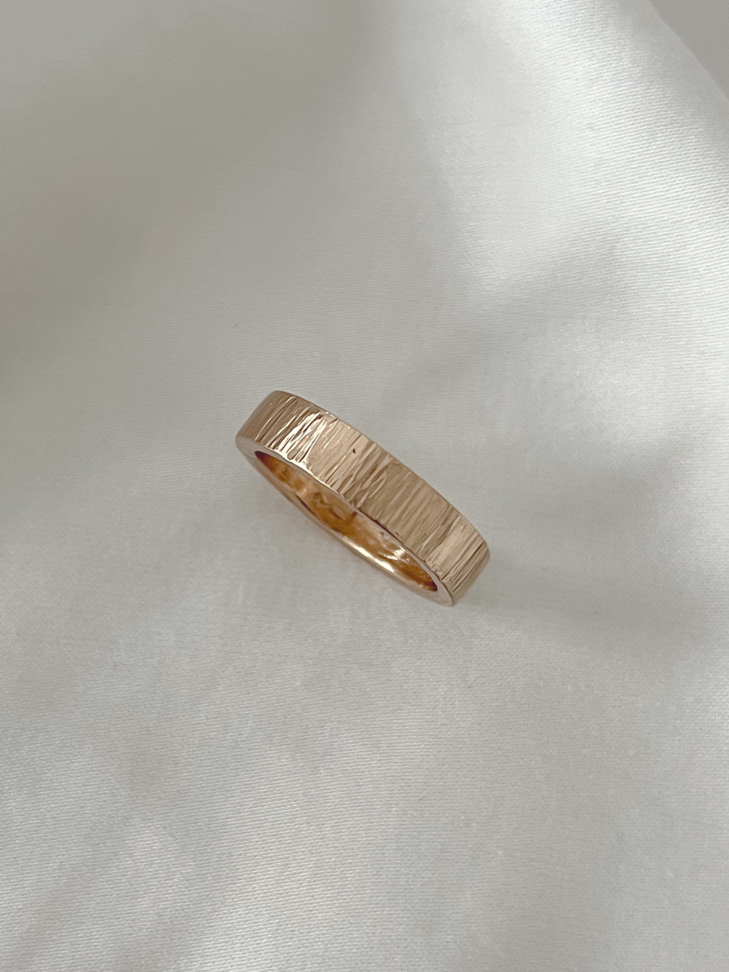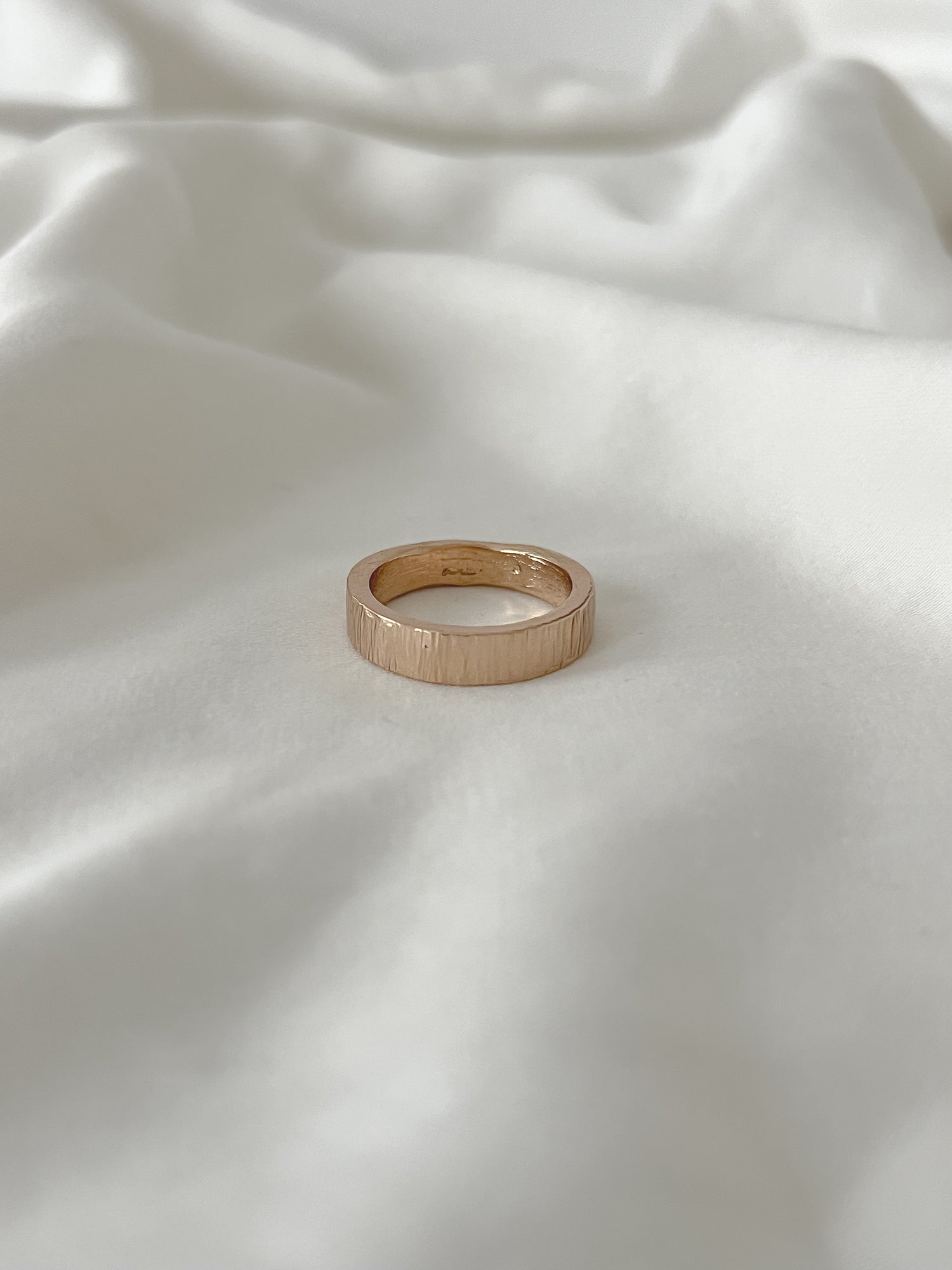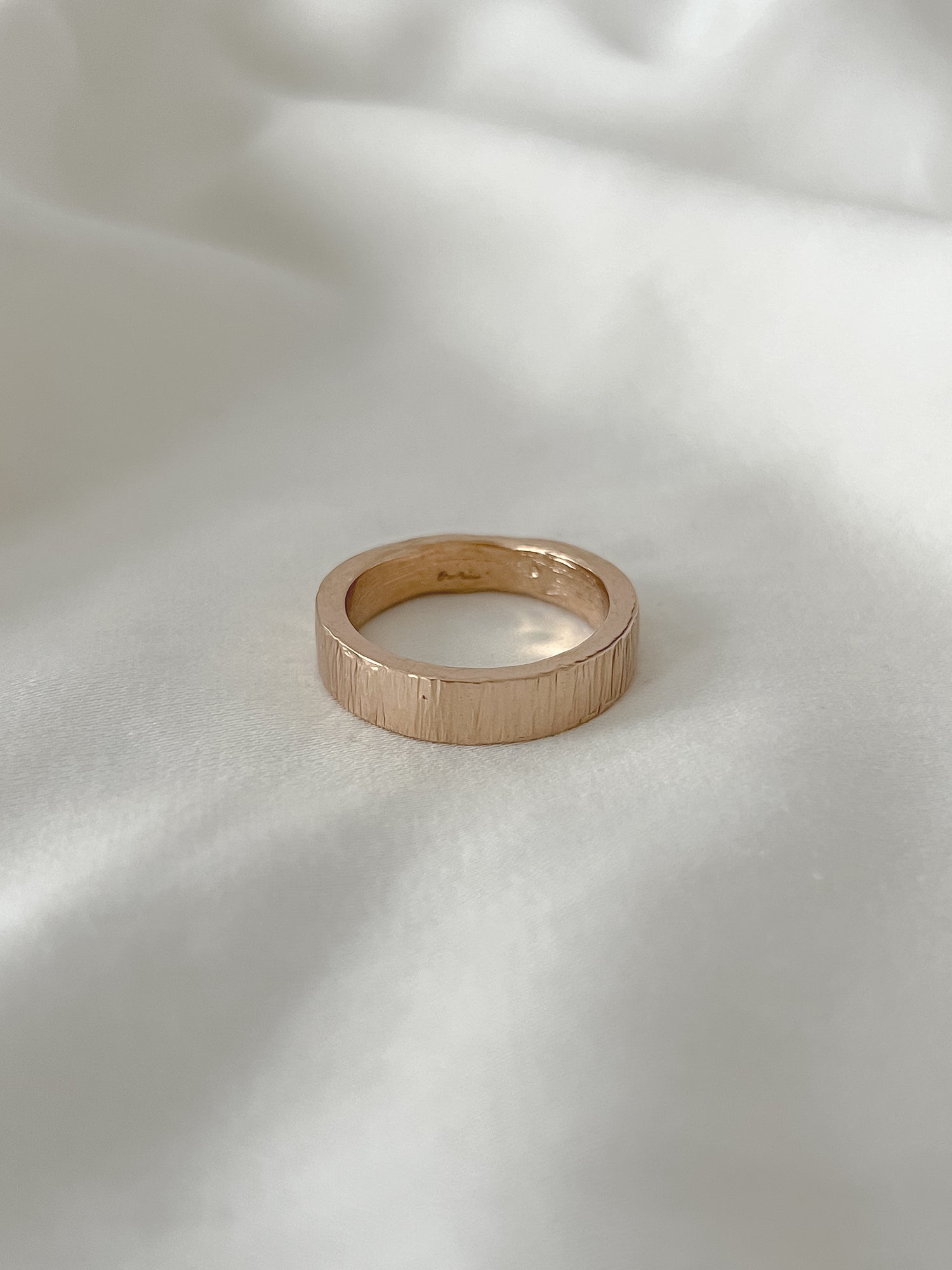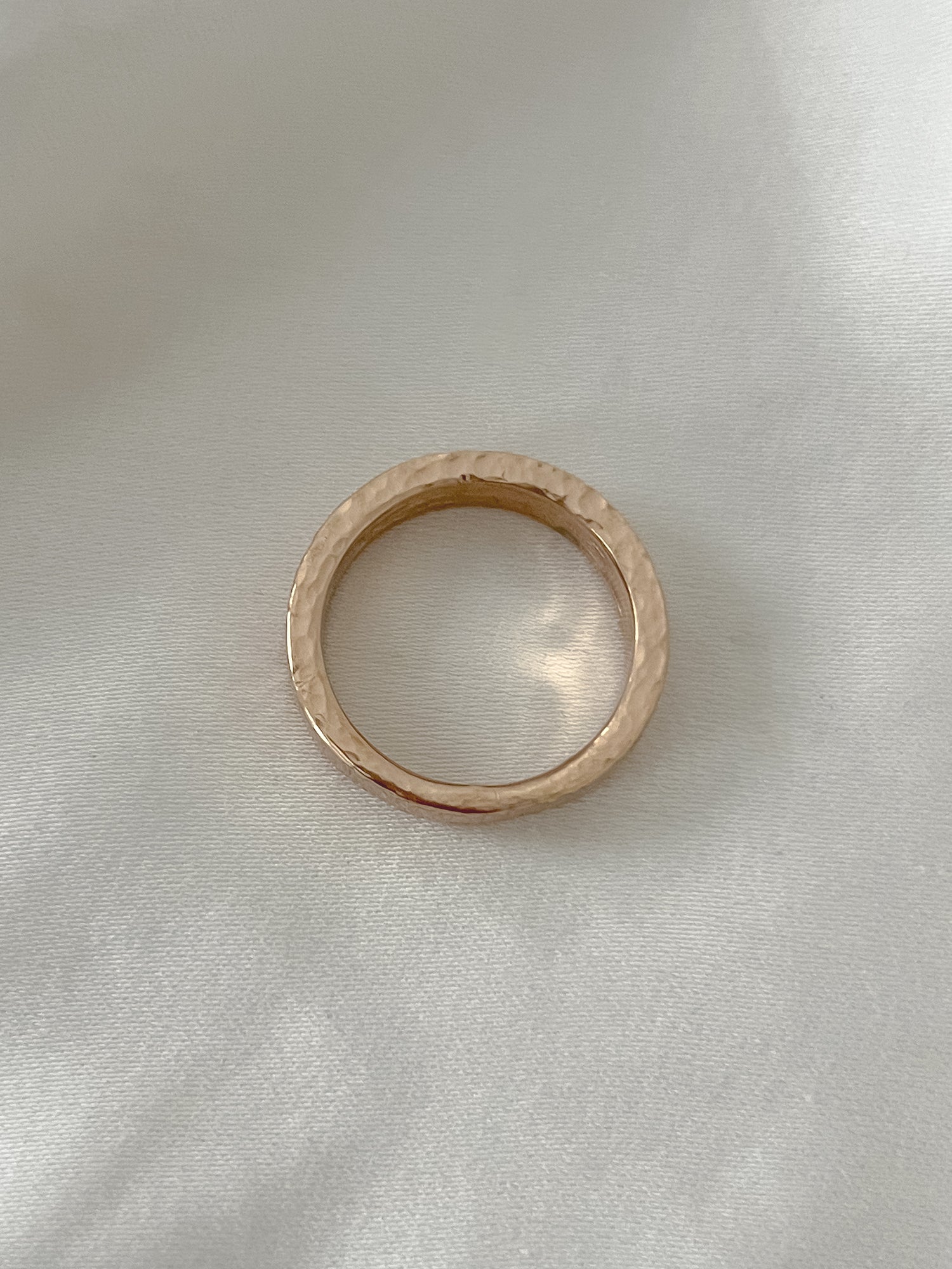 This ring also features raw inclusions such as indentations made from the clay and has a more organic shape- meaning it is not perfectly round. These are completely normal things that happen during the sand casting process and makes each and every ring even more unique!